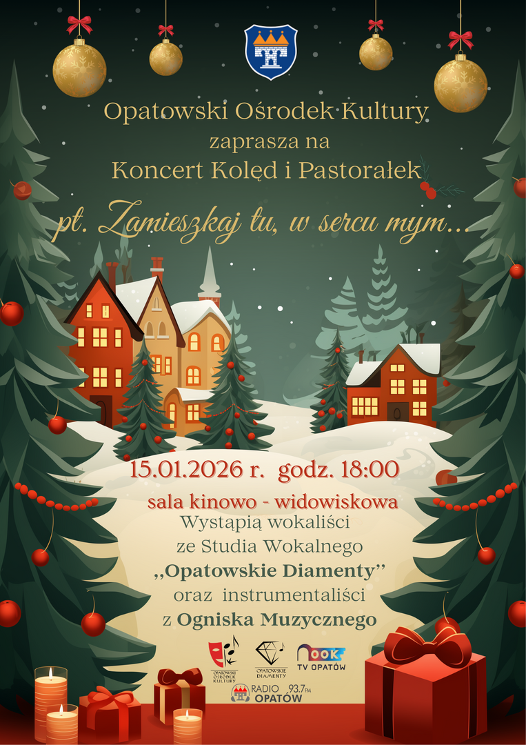 Opatowski Ośrodek Kultury serdecznie zaprasza na wyjątkowy wieczór muzyczny, który odbędzie się w ramach obchodów okresu bożonarodzeniowego. Podczas wydarzenia zatytułowanego „Zamieszkaj tu, w sercu mym...” będziemy mogli wspólnie wysłuchać najpiękniejszych kolęd i pastorałek.